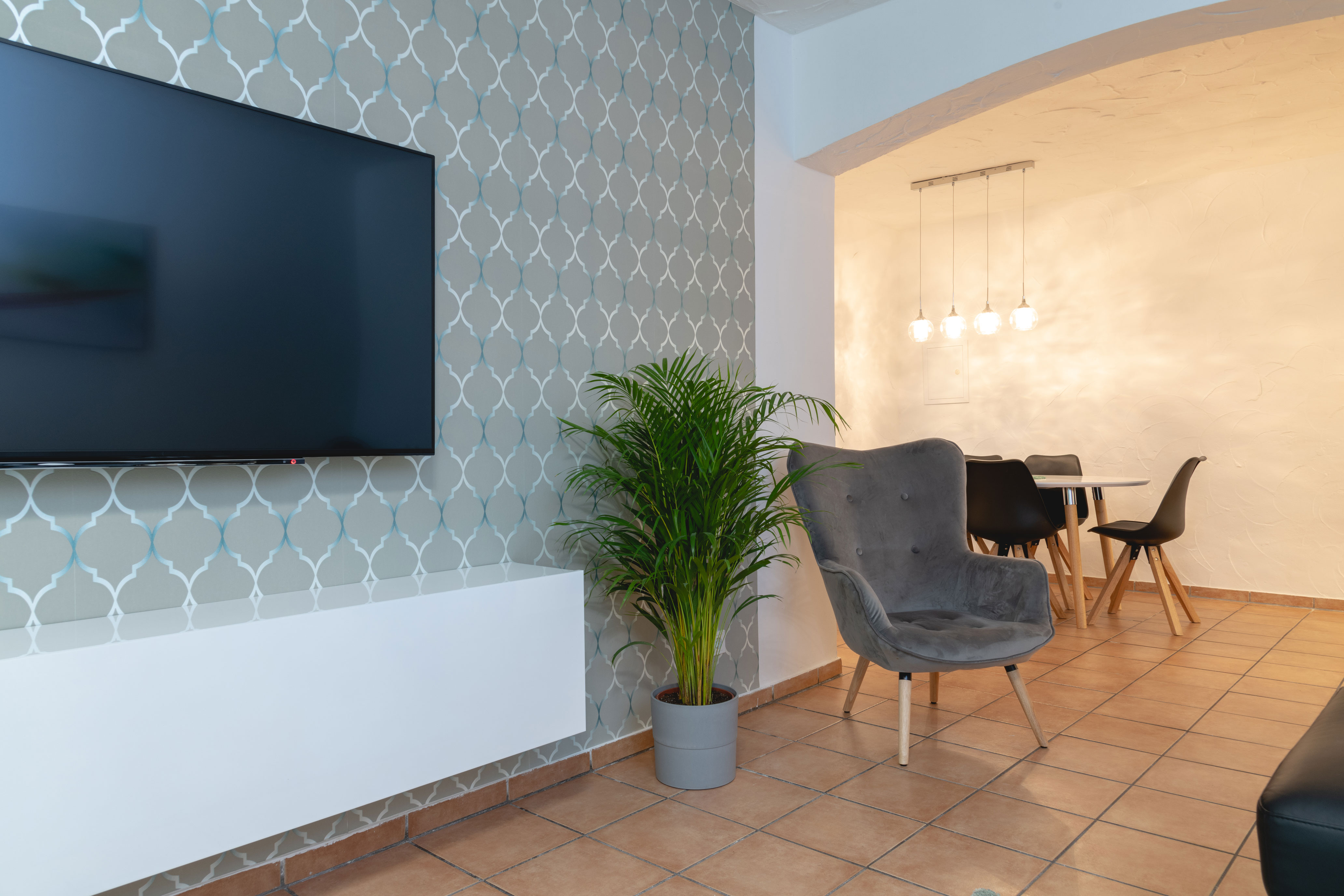 Das Wohnzimmer ist modern und geschmackvoll eingerichtet. Eine Essecke ist ebenfalls vorhanden. Ihnen steht ein uneingeschränktes Medienvergnügen zur Verfügung: kostenloses schnelles WLAN & ein großer Flachbildschirm.