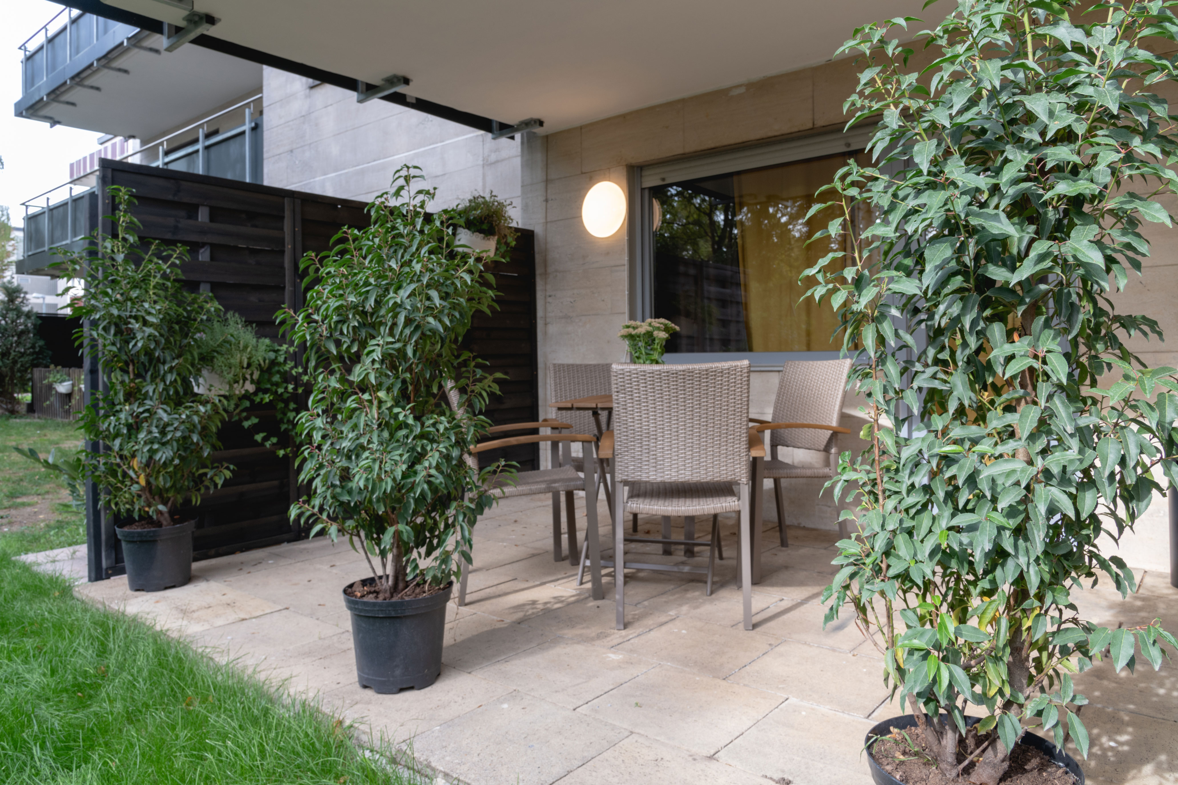 Eine große überdachte Terrasse mit Zugang zu einem kleinen Garten lädt Sie zum Entspannen an der frischen Luft ein. Hier kann ggf. auch geraucht werden.